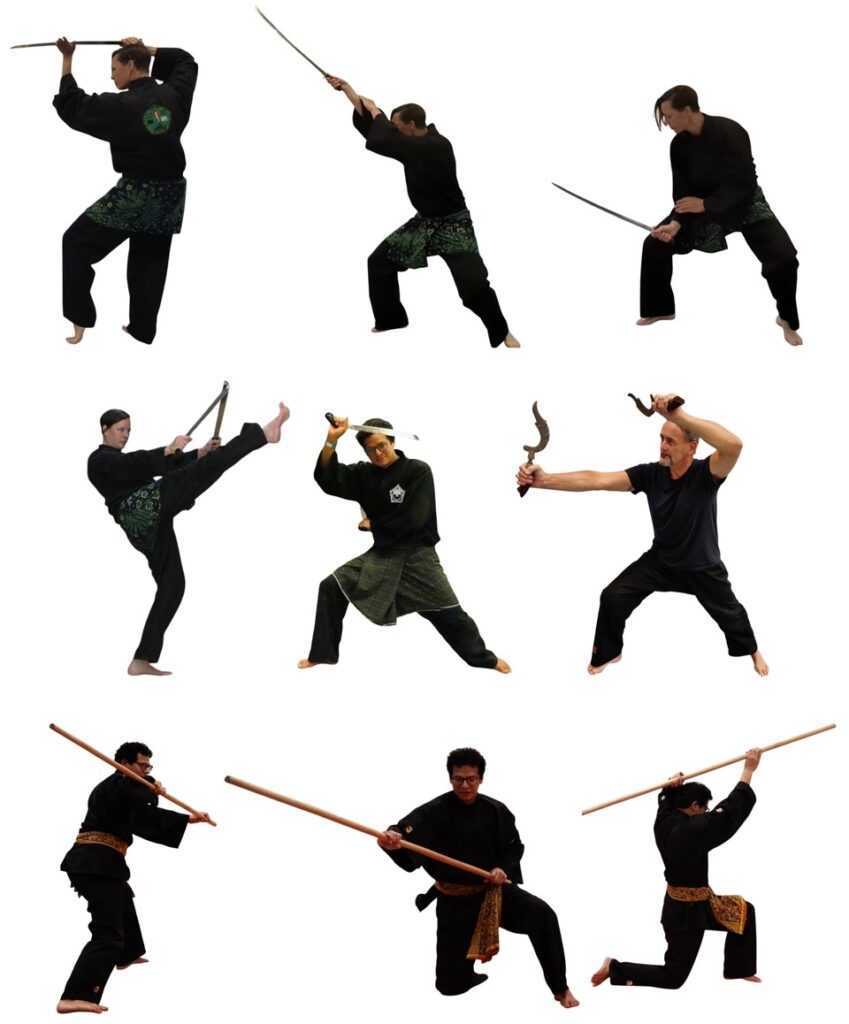 We trainen met verschillende wapens in de les. Met de wapens leer je langkah’s lopen en leer je technieken mee uit te voeren. We lopen ook met verschillende wapens tegenover elkaar.